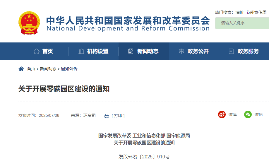 國家發(fā)展改革委 工業(yè)和信息化部 國家能源局印發(fā)《關(guān)于開展零碳園區(qū)建設的通知》 2025-07-08